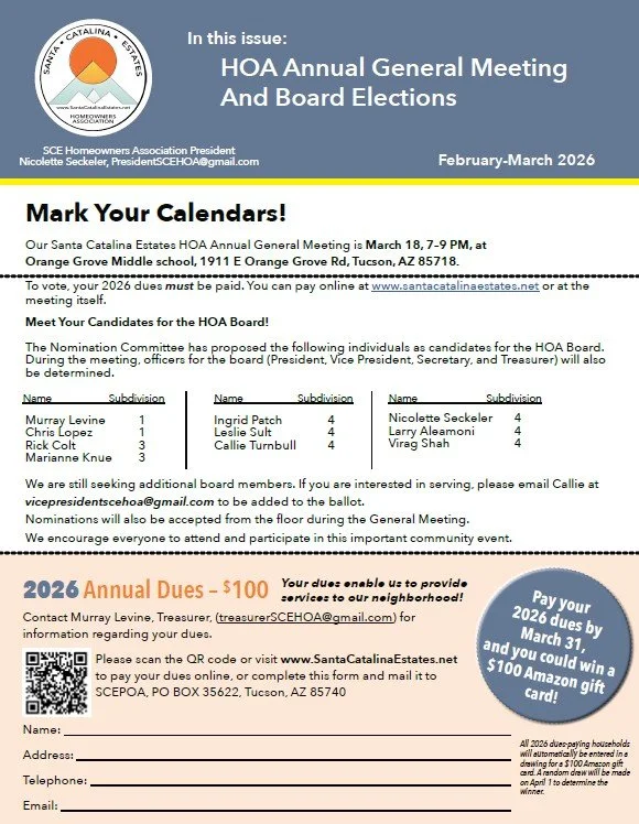 Please join us for our Annual Block Party supported by our Santa Catalina Estates HOA! The annual Neighborhood Watch Block Party is a key event to ensure that we meet the criteria to keep our Neighborhood Watch signs up at the various entrances to our subdivision. Your attendance at the Block Party and signing-in helps demonstrate to the county that we are actively watching out each and meeting as required. This is a great opportunity to meet your neighbors, enjoy good food and hear safety tips from a Pima County Sherriff. We are very fortunate that we have the financial support of our HOA to cover the costs of the main course. Please make sure your dues are paid.