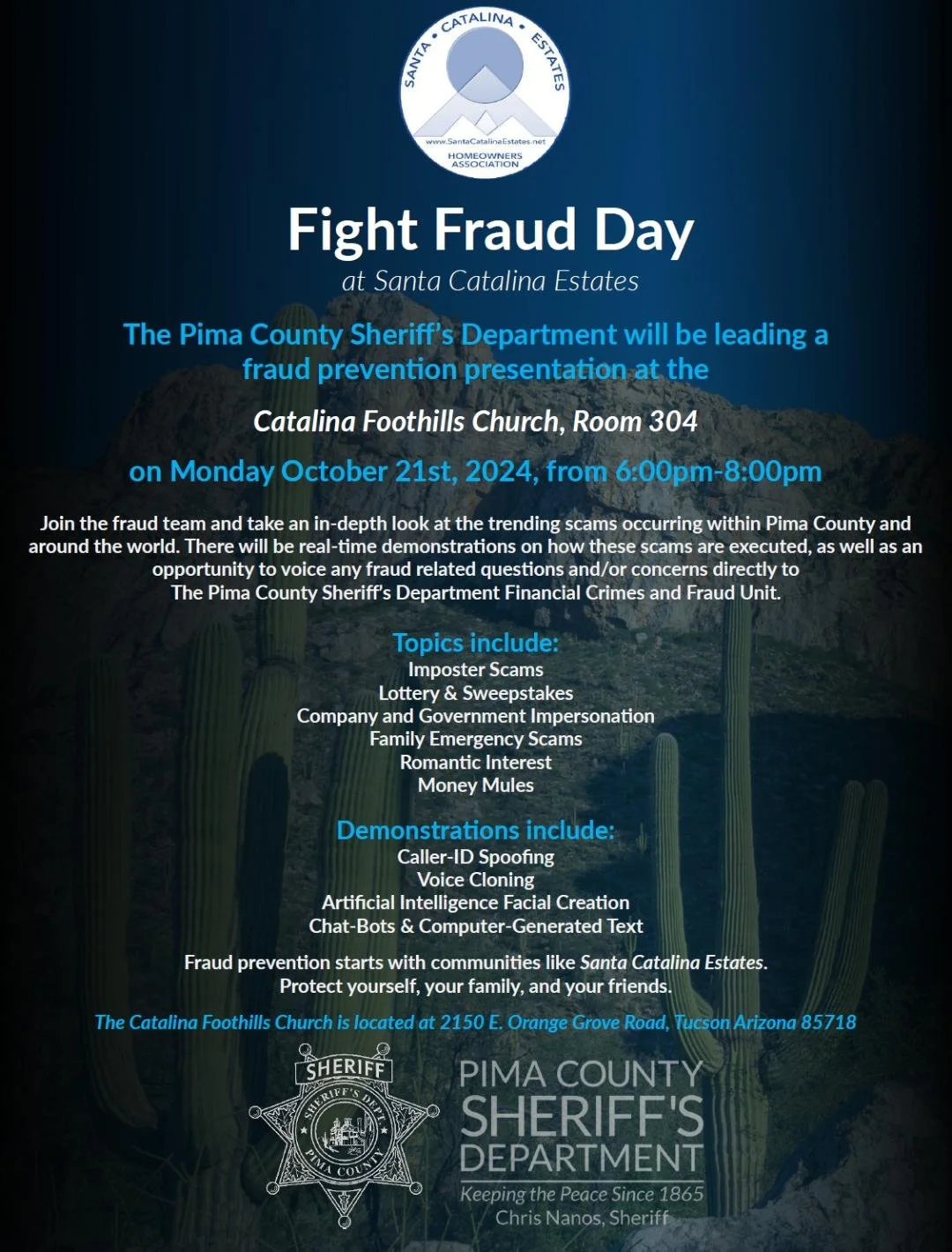 The Pima County Sheriff's Department's Financial Crimes and Fraud Unit will be leading this eye-opening presentation. Get ready for: